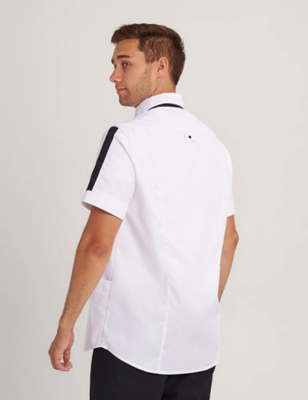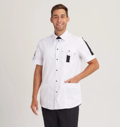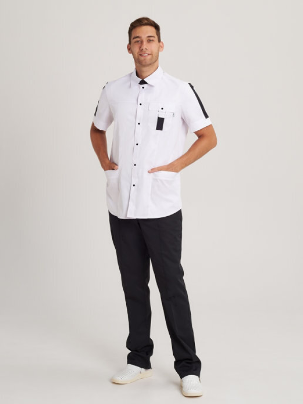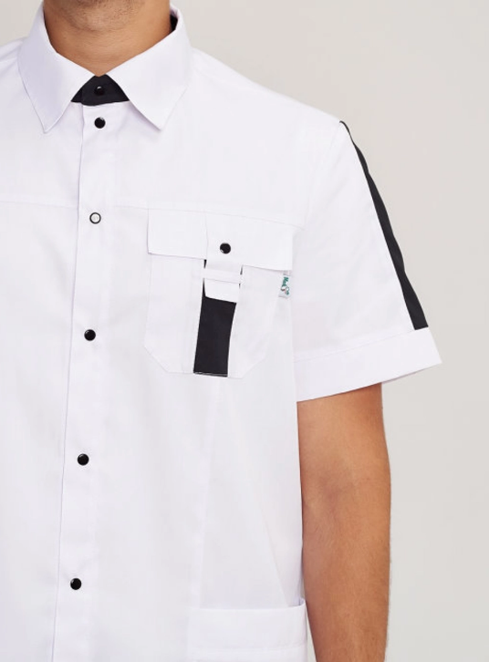 Белая медицинская блуза с коротким рукавом. Изделие с двумя вместительными карманами. Застегивается на кнопки из нержавеющей стали, производства Греция. Стильный воротник-стойка прикроет шею. Прямой фасон не сковывает движения. Для создания данной модели используется качественная ткань, не выгорающая и не истирающаяся.