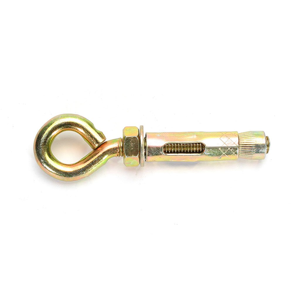 Болт анкерный с кольцом состоит из разжимающейся гильзы и шпильки с кольцевой головкой. Принцип действия метиза заключается в распирании его «рубашки» коническим элементом, за счет чего и обеспечивается прочное и надежное закрепление в материале. Распорный анкер-болт работает только в крепких и плотных строительных основаниях (бетон, кирпич, камень). Анкерный болт с ушком применяется при монтаже подвесных систем и создания растяжек с использованием веревок, цепей, тросов. Замкнутая петля в отличие от крюка исключает риск выпадения оснастки из зацепления. Высокие показатели нагрузки на вырывание позволяют применять его для подвеса предметов большого веса и фиксации строительных лесов.