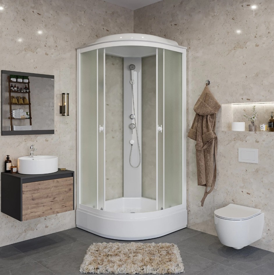Характеристики душевых кабин Promo включают матовое стекло толщиной 4 мм и алюминиевые белые крашеные профили, которые обеспечивают прочность и долговечность. В комплекте имеется ручной душ, верхний душ и центральная панель белого цвета. Дно поддона усиленное, выдерживает максимальный вес до 350 кг.