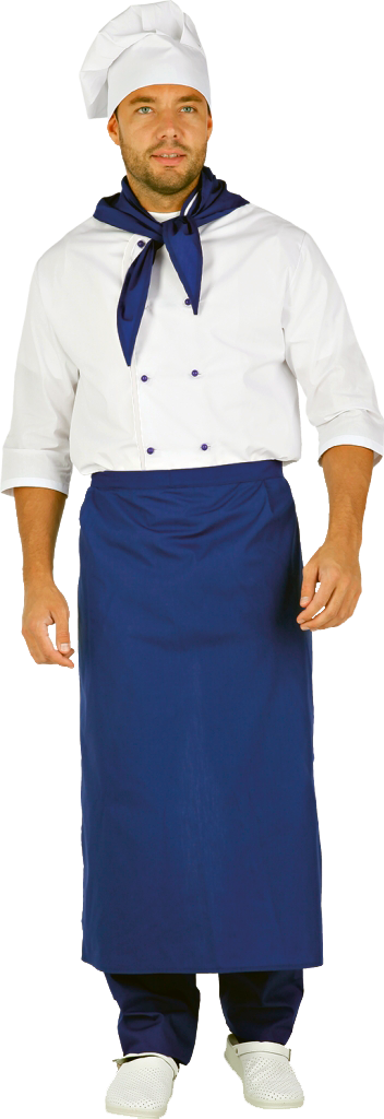 Униформа предназначена для главы кухонных процессов – шеф-повара. Куртка обладает двубортной застёжкой в виде контрастных по цветовой гамме пуклей. Поверх воротника-стойки повязывается васильковый платок. Рукава имеют длину ¾. Брюки и фартук пошиты из ткани василькового цвета. Штаны имеют свободную форму, не сковывают движений. Фартук не только предохраняет от загрязнений нижнюю одежду, но и дополняет образ в целом. В комплект входит колпак.