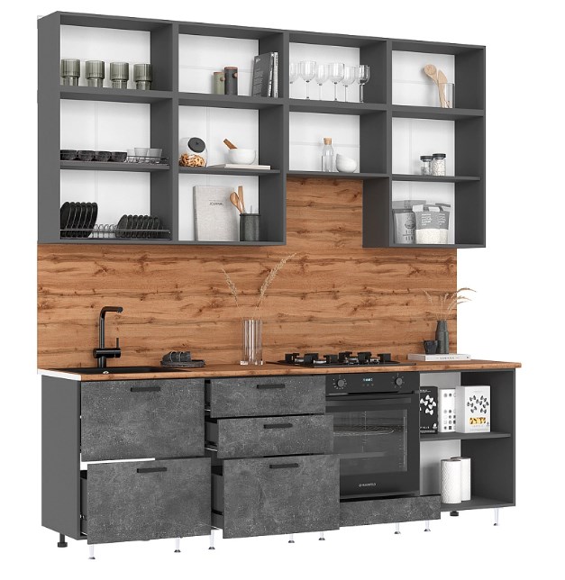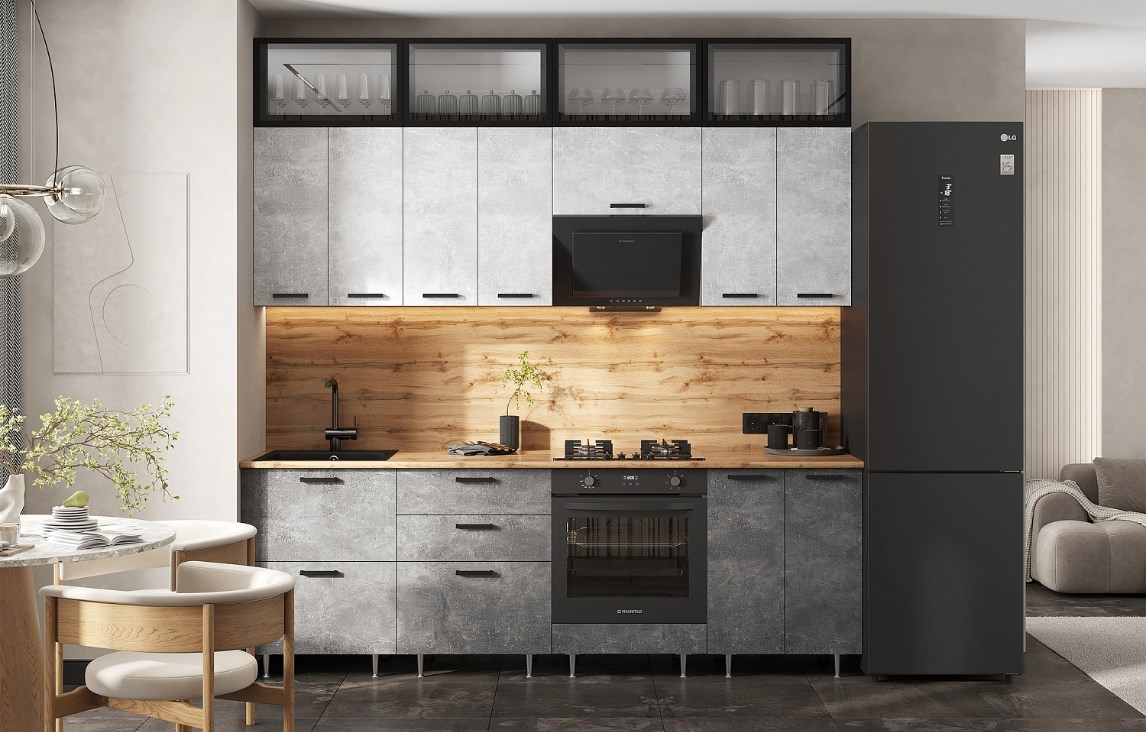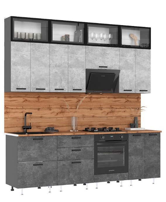 Кухня Рио Нью 2,4/1080м (490) Компановка №4 Бетон светлый/Бетон темный/Графит (дуб вотан)