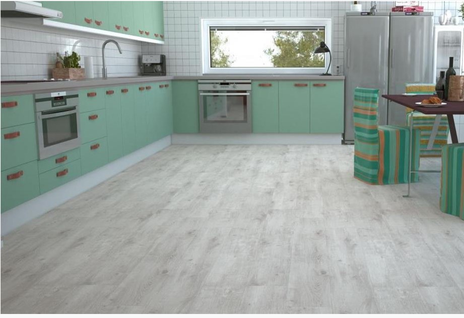 Ламинат из коллекции Blue Дуб Эверест светлый с имитацией дуба для дачи, для квартиры, для коридора, для офиса, для кабинета с четырёхсторонней фаской с матовой поверхностью с замковым соединением серого цвета.