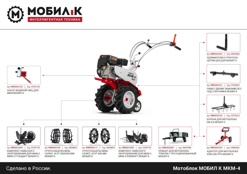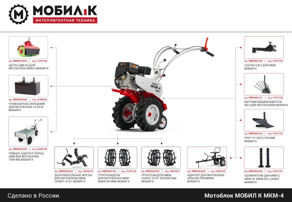 Мотоблок Мобил К МКМ-4 КОМФОРТ применяется на больших участках для обработки почвы. Наличие вала отбора мощности позволяет использовать активное навесное оборудование, расширяющее спектр задач, выполняемых агрегатом. Длительный срок службы обеспечен устойчивым к коррозии алюминиевым корпусом редуктора, а также двигателем с большим рабочим ресурсом.