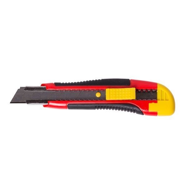 Двухкомпонентный корпус из ABS-пластика с вставками из термопластичной резины, металлическая направляющая 0,5 мм, автоматический фиксатор лезвия, лезвие из углеродистой стали 60Г.