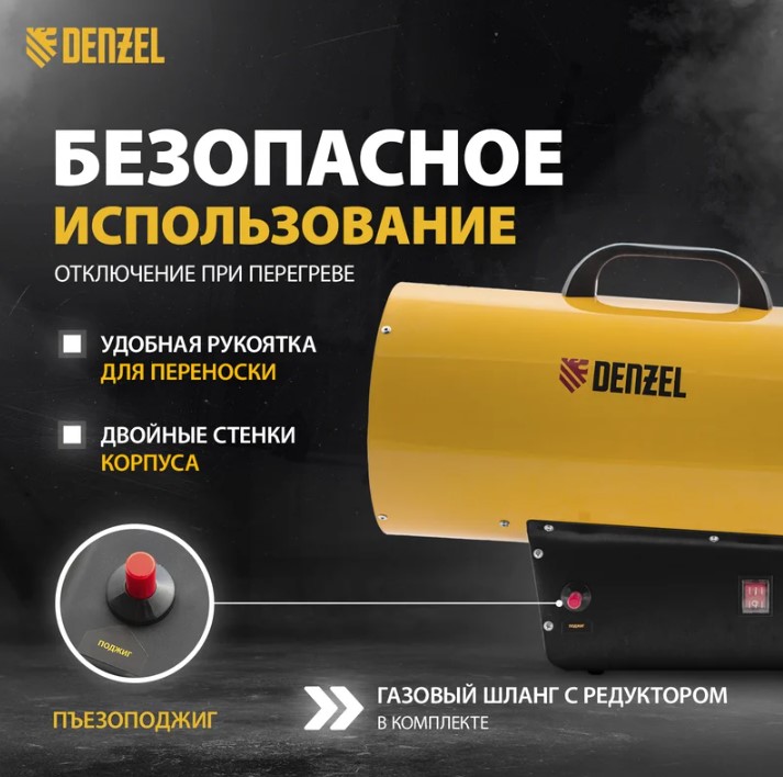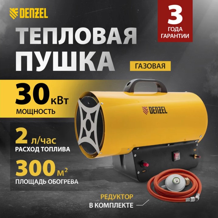 Газовая тепловая пушка Denzel GHG-30 96479 мощностью 30 кВт работает на смеси пропан-бутан и выдает тепловой поток со скоростью 900 куб. м/ч. Используется для обогрева складов, цехов, гаражей, теплиц и других нежилых помещений площадью до 300 кв. м. Будет полезна на строительных площадках и в производственных помещениях.