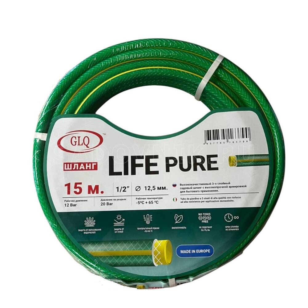 Шланг 1/2 армированный 1/2"х15м LIFE Pure 12Бар 3-х слойн GLQ